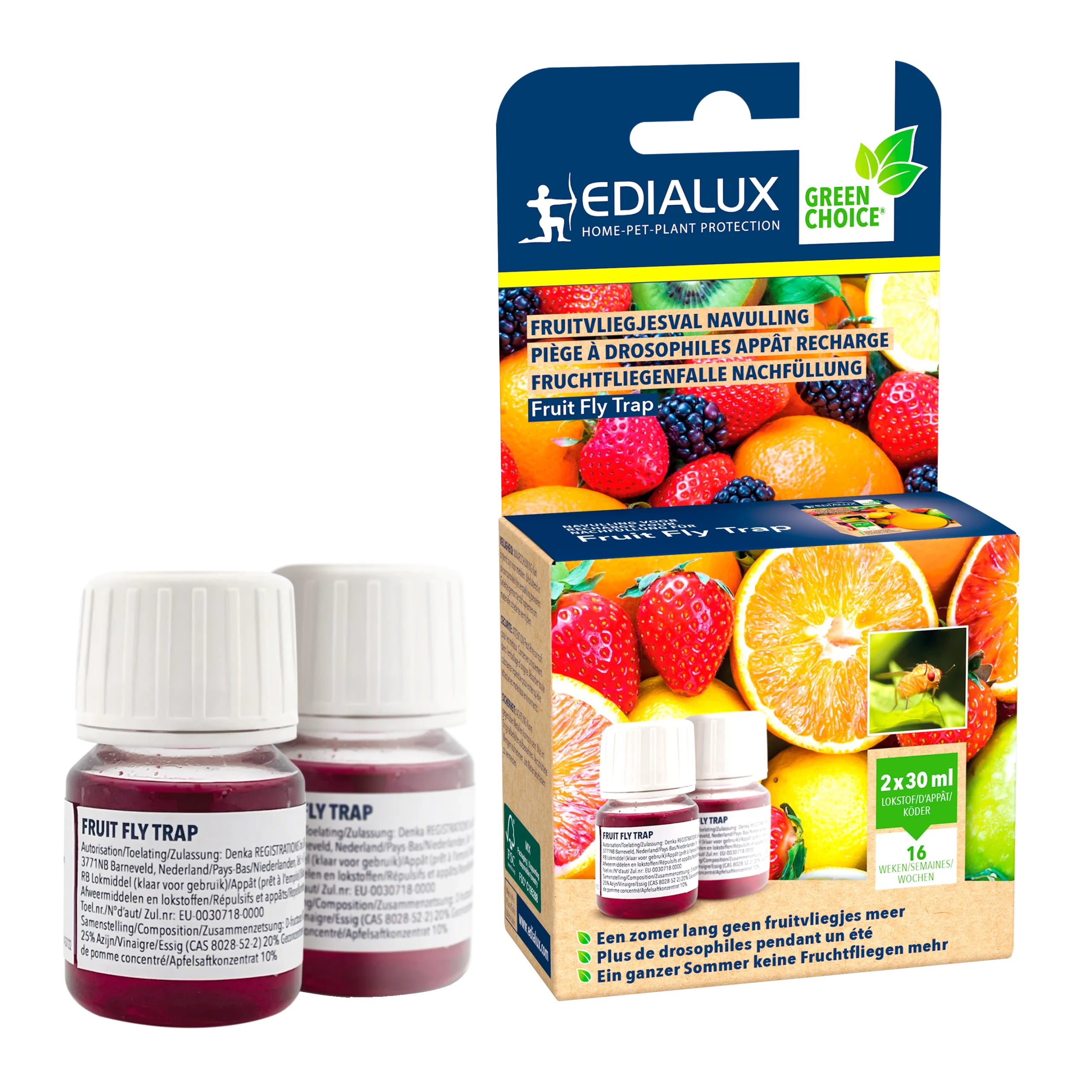 Houd je herbruikbare fruitvliegjesval de hele zomer effectief met onze navulling, bestaande uit 2 flesjes van 30 ml lokstof. Speciaal ontwikkeld om fruitvliegjes in huis aan te trekken en vast te houden, biedt elk flesje tot 4 weken bescherming. De navulling past perfect bij de peervormige val en helpt om je keuken en fruit vers en vrij van fruitvliegjes te houden. Handig en eenvoudig in gebruik voor langdurige bescherming.
