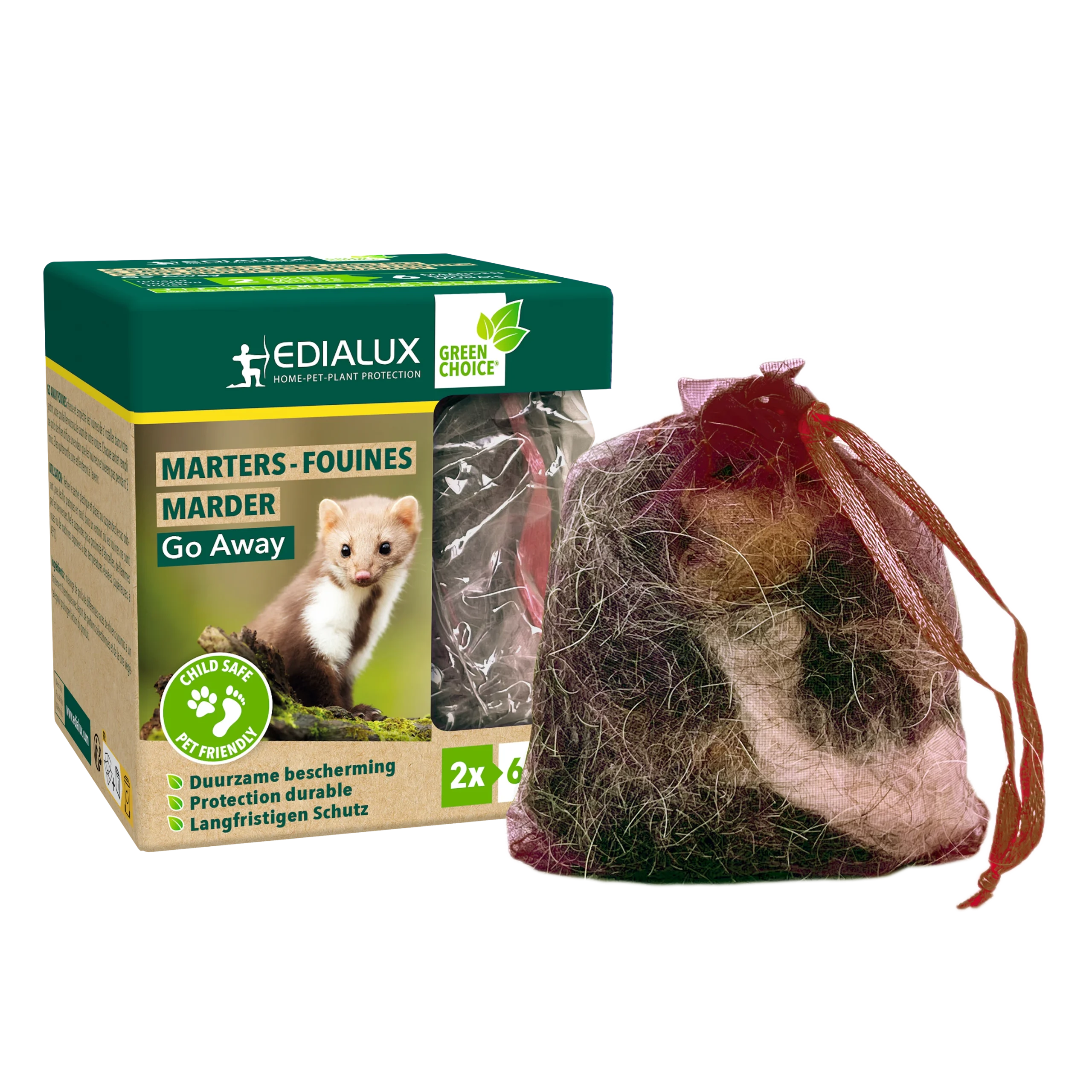 Dit thermisch behandelde hondenhaar met toevoeging van geurstoffen en plantaardige was verjaagt en voorkomt marters in uw tuin, kippenhok of onder de motorkap van de auto. Plaats of hang het geurzakje op een plaats waar marters niet gewenst zijn. Ieder volledig natuurlijk geurzakje verspreidt gedurende 3 maanden een geur die marters niet verdragen. Zij zullen de omgeving verlaten en in de toekomst mijden.