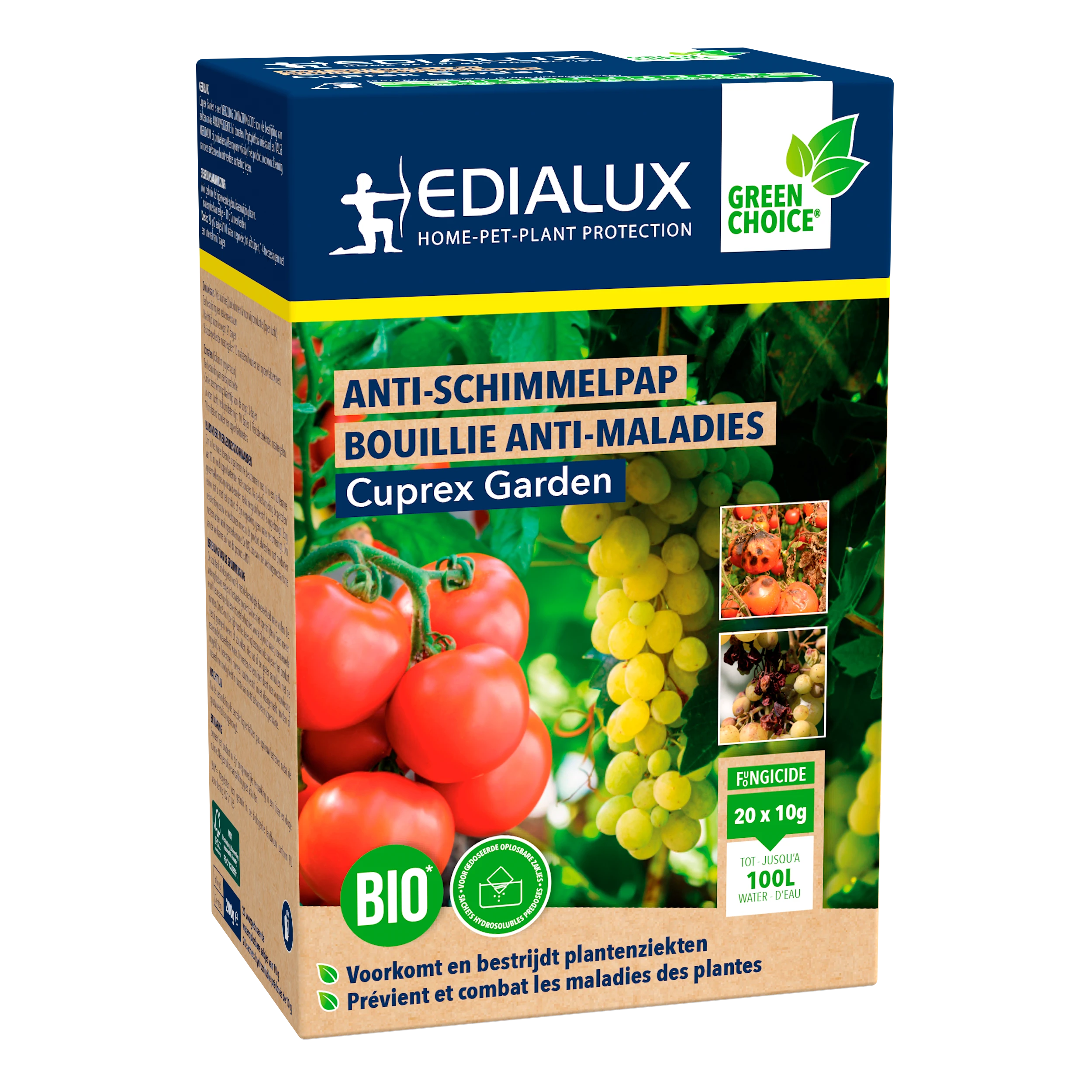 Veelzijdig middel dat werkzaam is voor de bestrijding van valse meeldauw bij tomaten, zowel in serres als buiten en druivelaars. Cuprex Garden heeft een contactwerking wat betekent dat de kieming van schimmels wordt vermeden, alsook een verdere aantasting van de plant. Reeds voor gedoseerd in handige water oplosbare zakjes waardoor het product niet stuift. Bij regelmatige behandeling zal dit middel ook genezend werken.