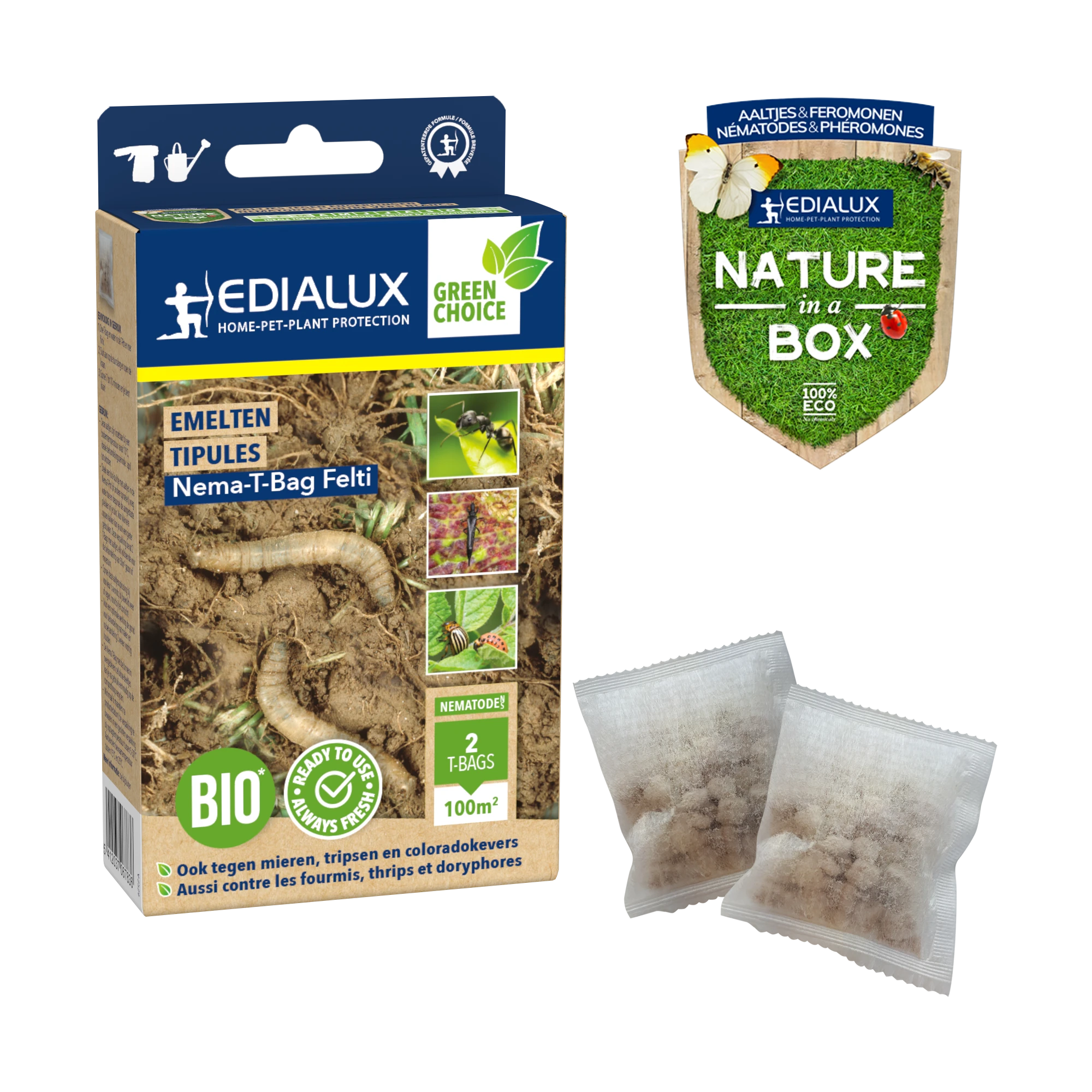 Nema T-Bag Felti is een mengeling van aaltjes ter biologische bestrijding van emelten, trips, coloradokevers en mieren. Aaltjes zijn microscopisch kleine rondwormen die in de bodem leven. Ze dringen de larven van emelten binnen, vreten ze volledig op en leggen er hun eitjes in. Na 2 tot 6 weken verschijnen er weer nieuwe aaltjes, die opnieuw hun werk doen, net zo lang er larven in de bodem zijn. Voor de bladbehandeling van coloradokevers is het noodzakelijk de larven te raken op of onder de bladeren. Houdbaarheid: 6 maanden