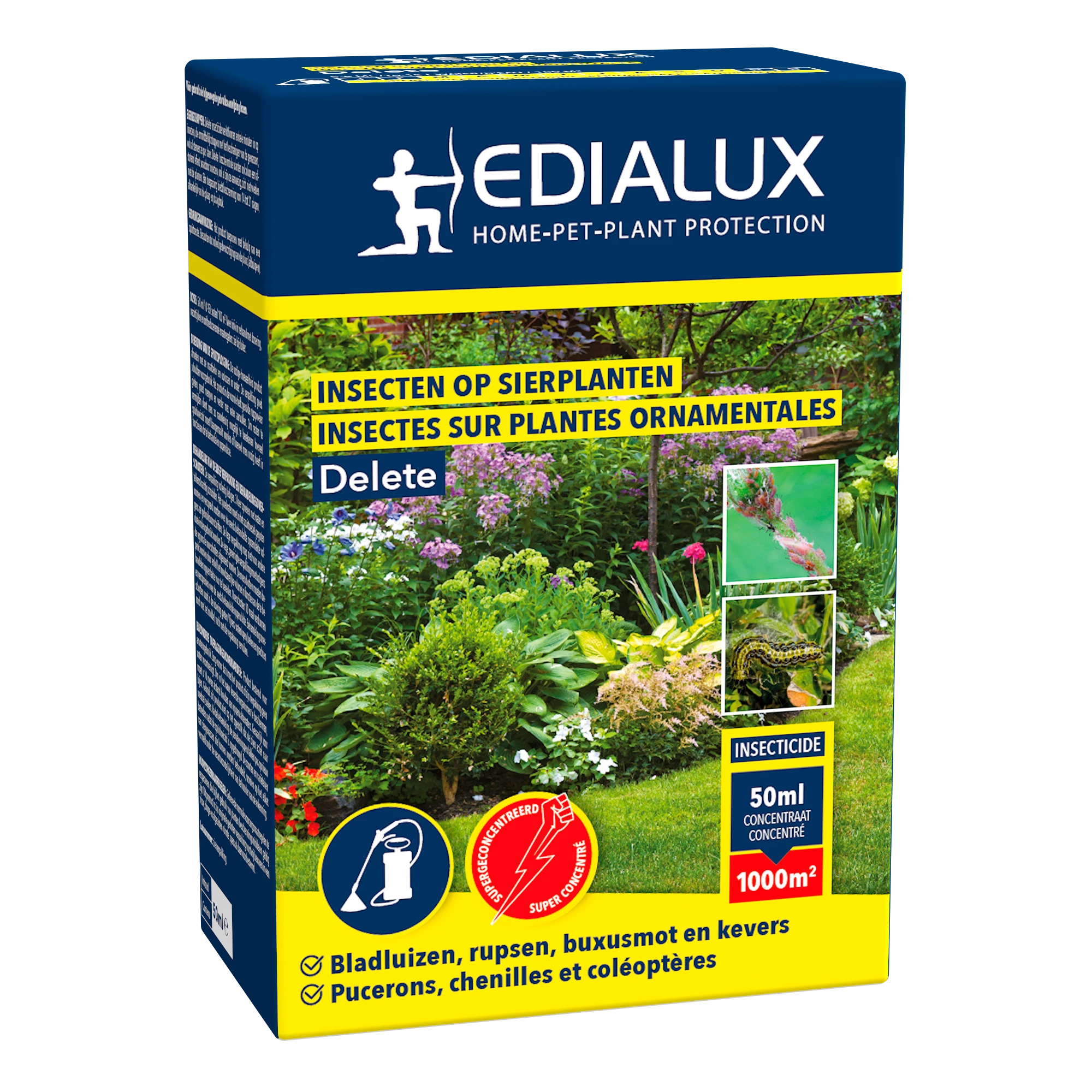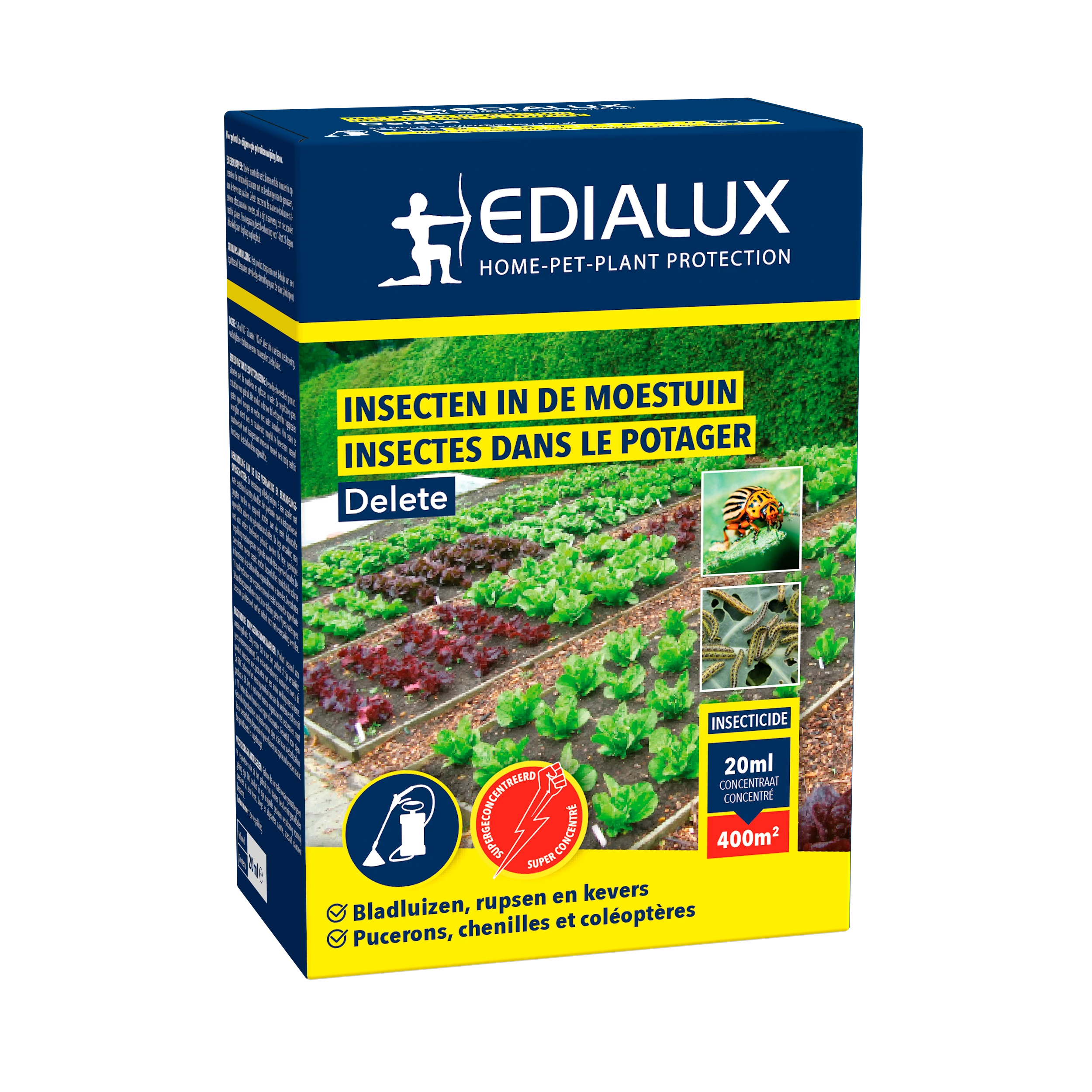 Insecticide voor snelle bestrijding van bladluizen, rupsen en kevers in moestuin en siertuin. Delete insecticide werkt binnen enkele minuten in op insecten, die onmiddellijk stoppen met het beschadigen van de gewassen, ook al sterven ze pas later. Delete beschermt de planten ook door een afstotend effect, waardoor insecten, ook al zijn ze aanwezig, zich niet voeden met de planten.