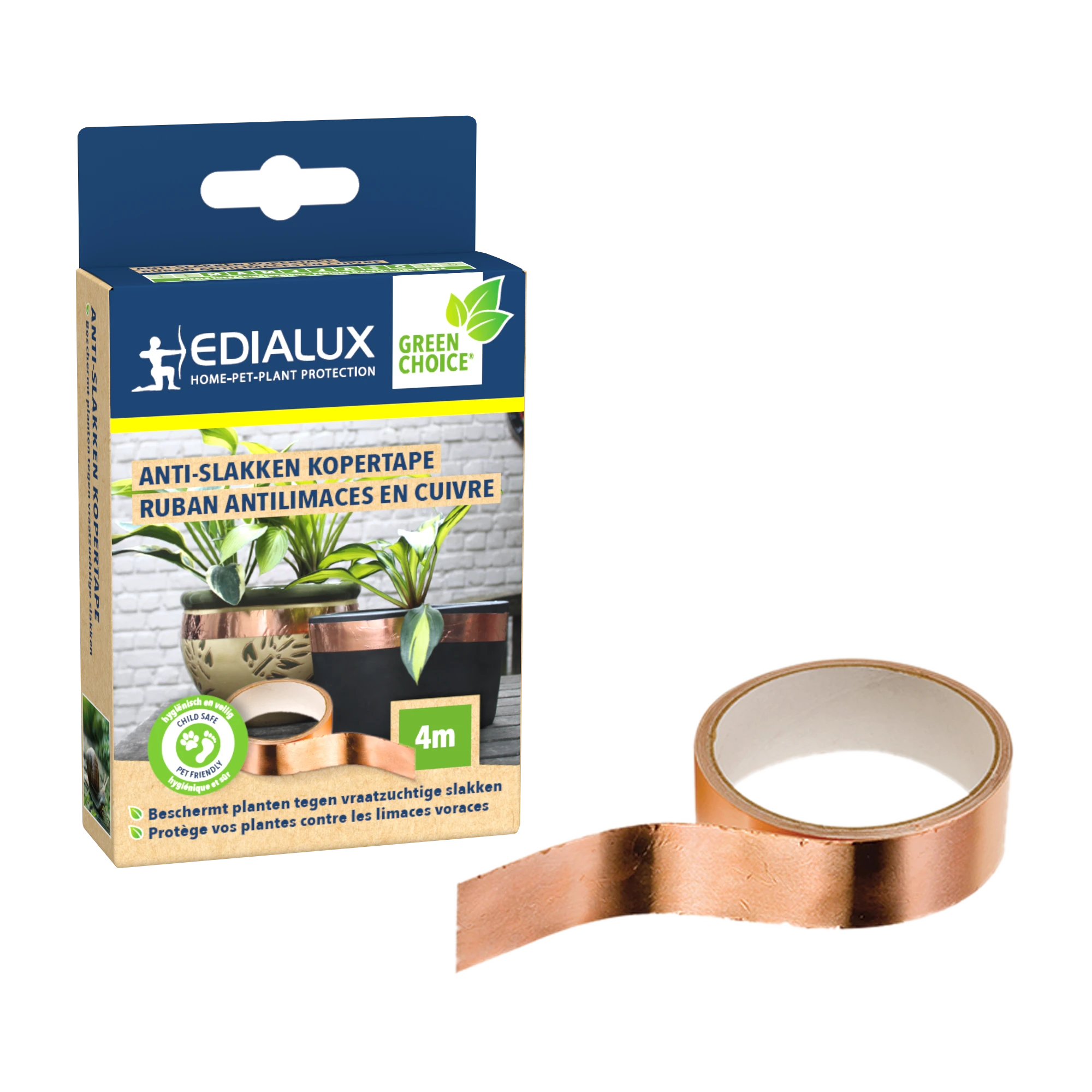 Deze niet giftige, zelfklevende, kopertape van 4 meter lengte beschermt op een milieuvriendelijke en doeltreffende wijze je favoriete planten tegen slakken. Wanneer een slak over de kopertape kruipt voelt ze een klein schokje en maakt snel rechtsomkeer. De tape kan je op gepaste lengte afknippen en aanbrengen op bloempotten, moestuinbakken, tuinmeubilair… De tape werkt dag en nacht, zowel bij nat als droog weer.