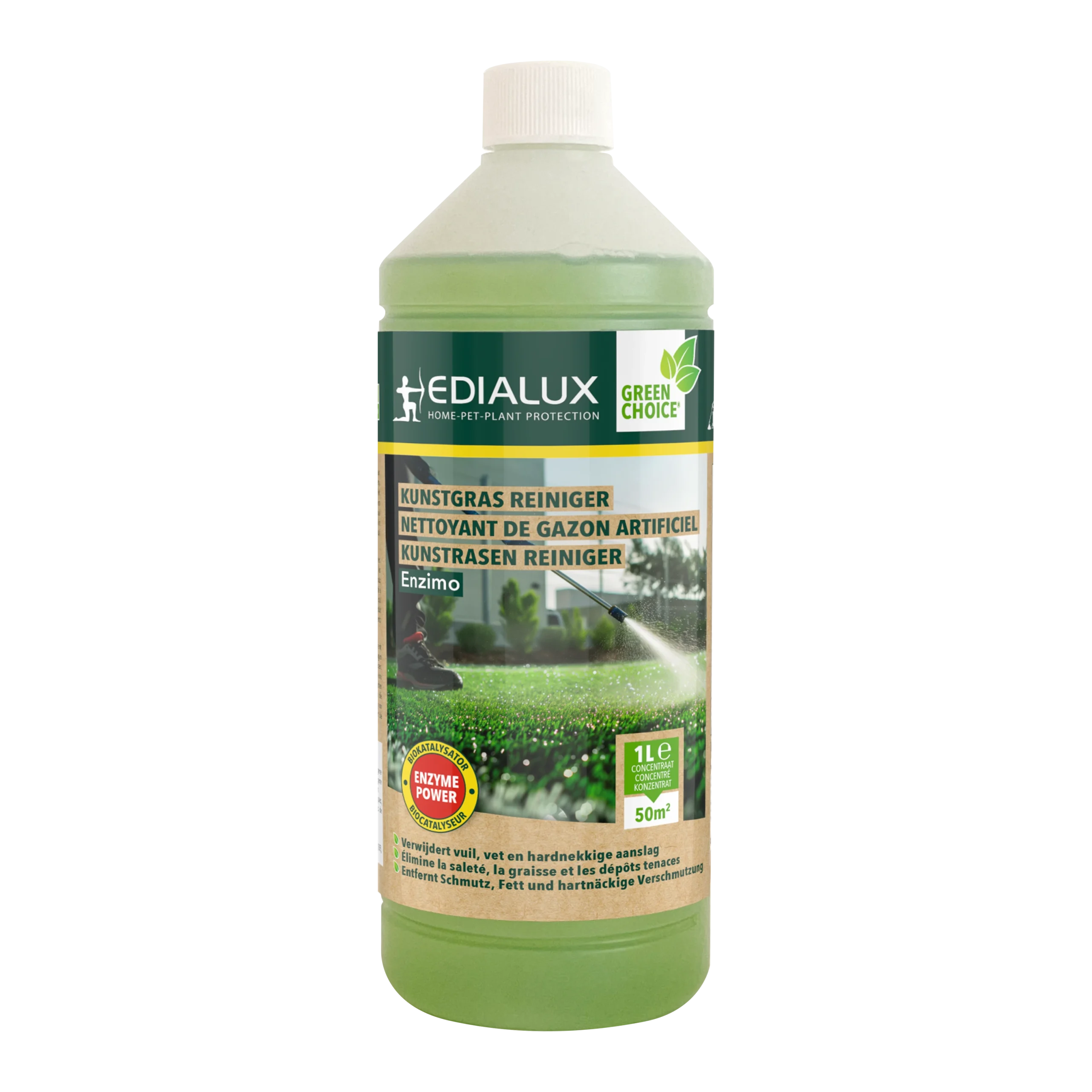 Enzimo Kunstgras reiniger is een vloeibaar reinigingsmiddel op basis van enzymen. Het verwijdert snel en eenvoudig vet, stuifmeel, fijnstof, uitwerpselen, roet, rookaanslag en andere atmosferische vervuiling van alle soorten kunstgras. Het product verfrist, reinigt en bevordert de waterdoorlaatbaarheid en voorkomt zo een vuile en gladde kunstgrasmat, wat de speeleigenschappen optimaliseert. De speciaal geselecteerde enzymen in het product breken de vervuiling af zoals de enzymen in ons lichaam het voedsel helpen verteren. Een regenbui spoelt het afgebroken vuil voor u weg en activeert de enzymen opnieuw voor een lange nawerking.
