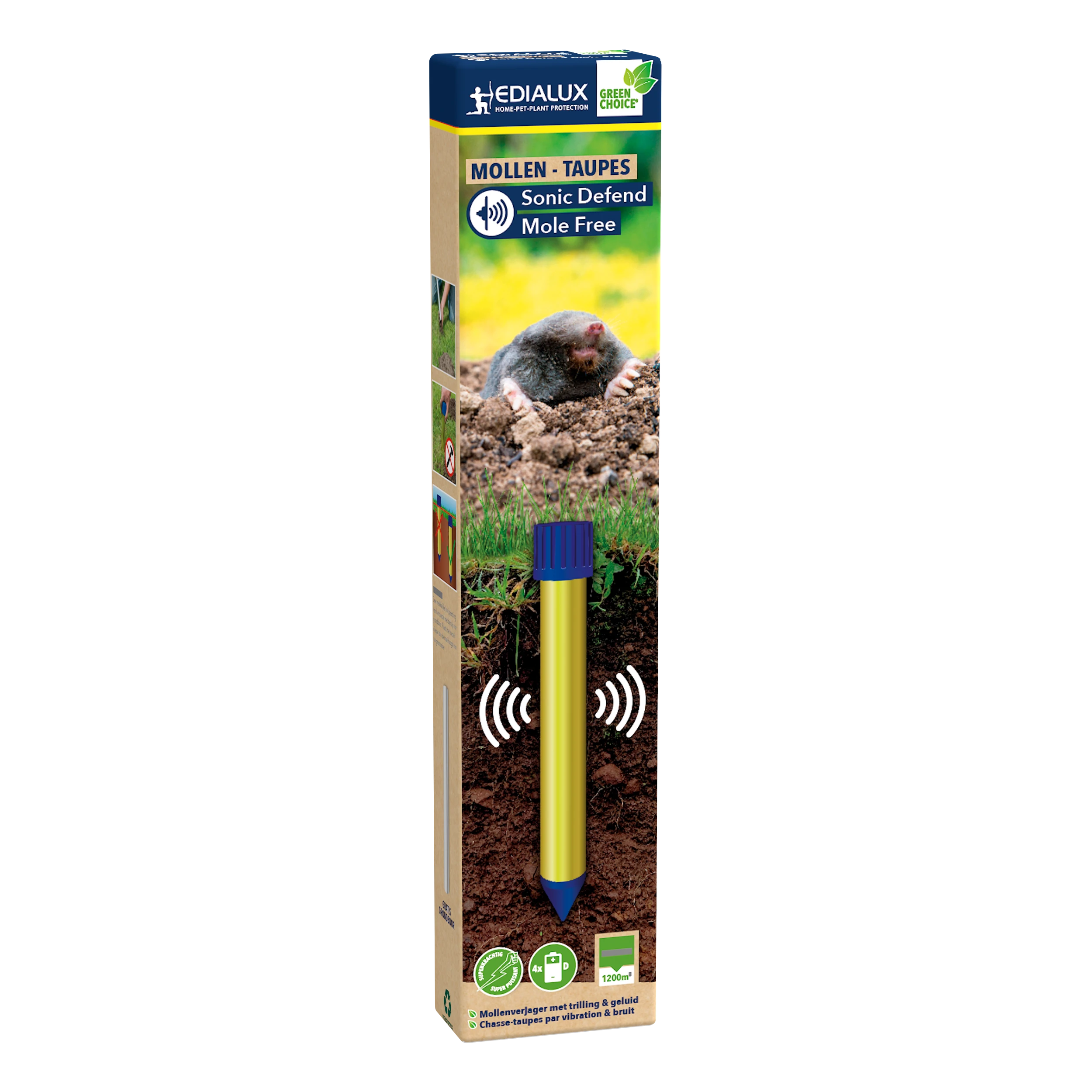 Dit vibratieapparaat tegen mollen werkt dankzij een energieaccumulator die wordt opgeladen door een zonnepaneel. Het toestel verjaagt mollen en knaagdieren door de verspreiding van ondergrondse trillingen. Er wordt gratis een grondperforator meegeleverd waardoor je het apparaat makkelijk kan verplaatsen. Voeding: 4 herlaadbare (1,2 V) of alkaline (1,5 V, type D) batterijen. Batterijen niet meegeleverd.