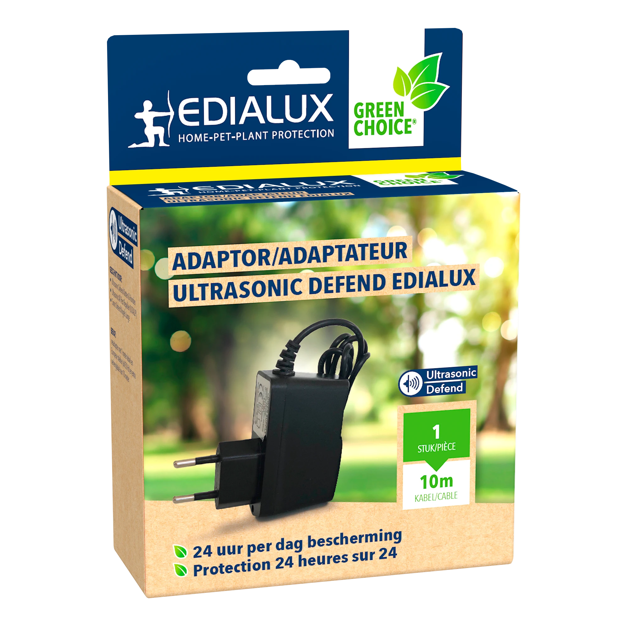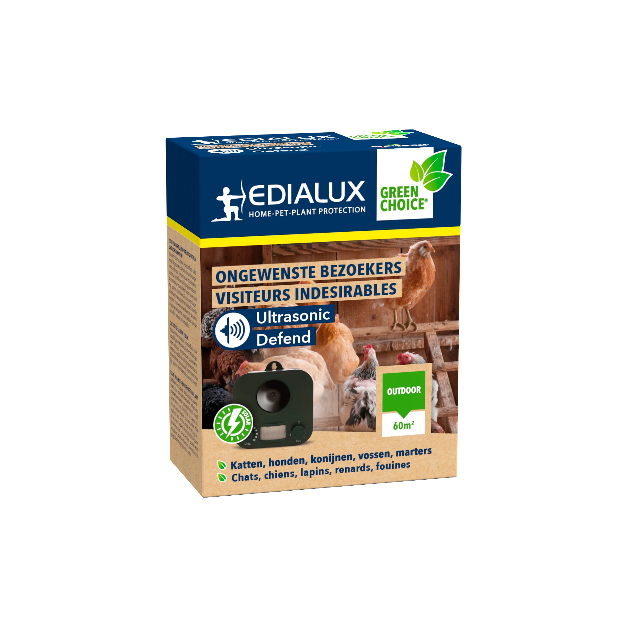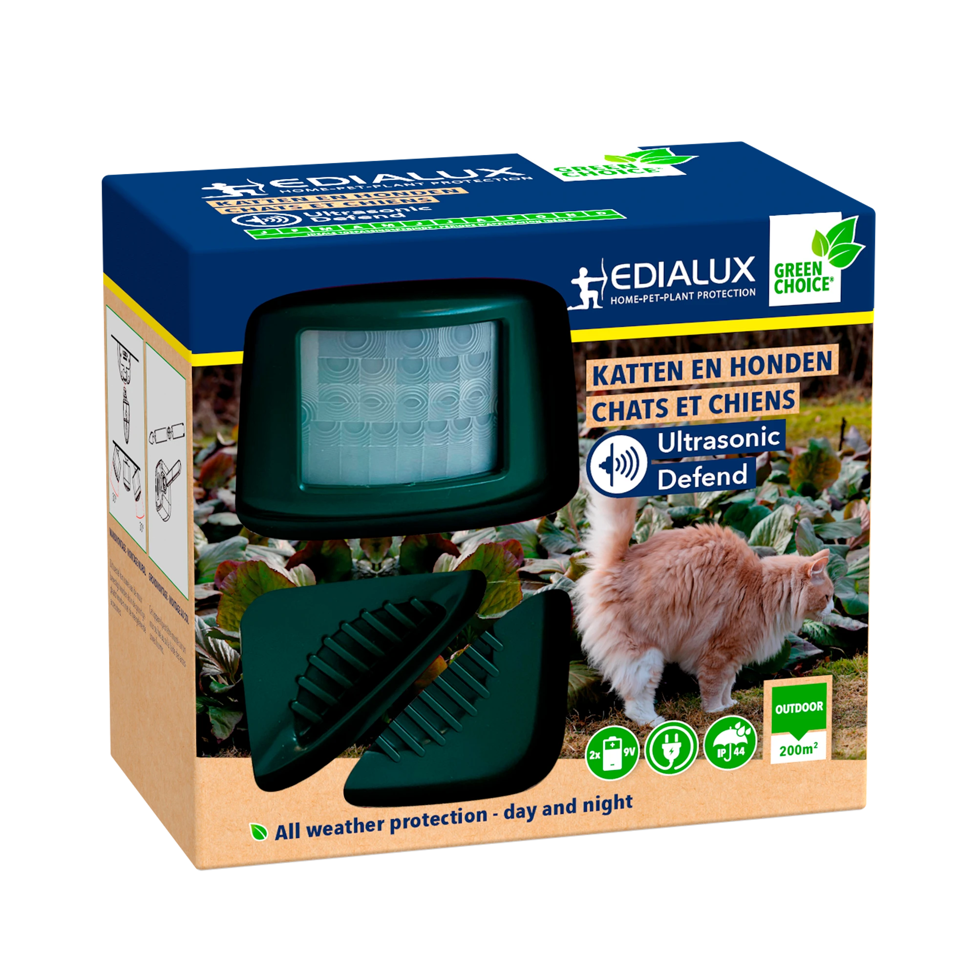 Ultrasoon apparaat om katten en honden of andere ongewenste dieren uit de tuin te verjagen. Het toestel heeft drie verschillende ultrasone frequentieinstellingen aangepast aan kleine of grote zoogdieren en kan zowel met een tijdsinterval of met de bewegingssensor ingesteld worden. Het geluid varieert constant, zodat dieren niet wennen aan het geluid en er niet resistent tegen worden. Het toestel kan aan de muur bevestigd worden of in de grond geplaatst met de bijgevoegde paal. Dit toestel werkt op 2 batterijen (9 volt, niet meegeleverd) of kan met de afzonderlijk verkrijgbare Adapter Ultrasonic Defend Edialux (1112000106) aan het elektriciteitsnet aangesloten worden.