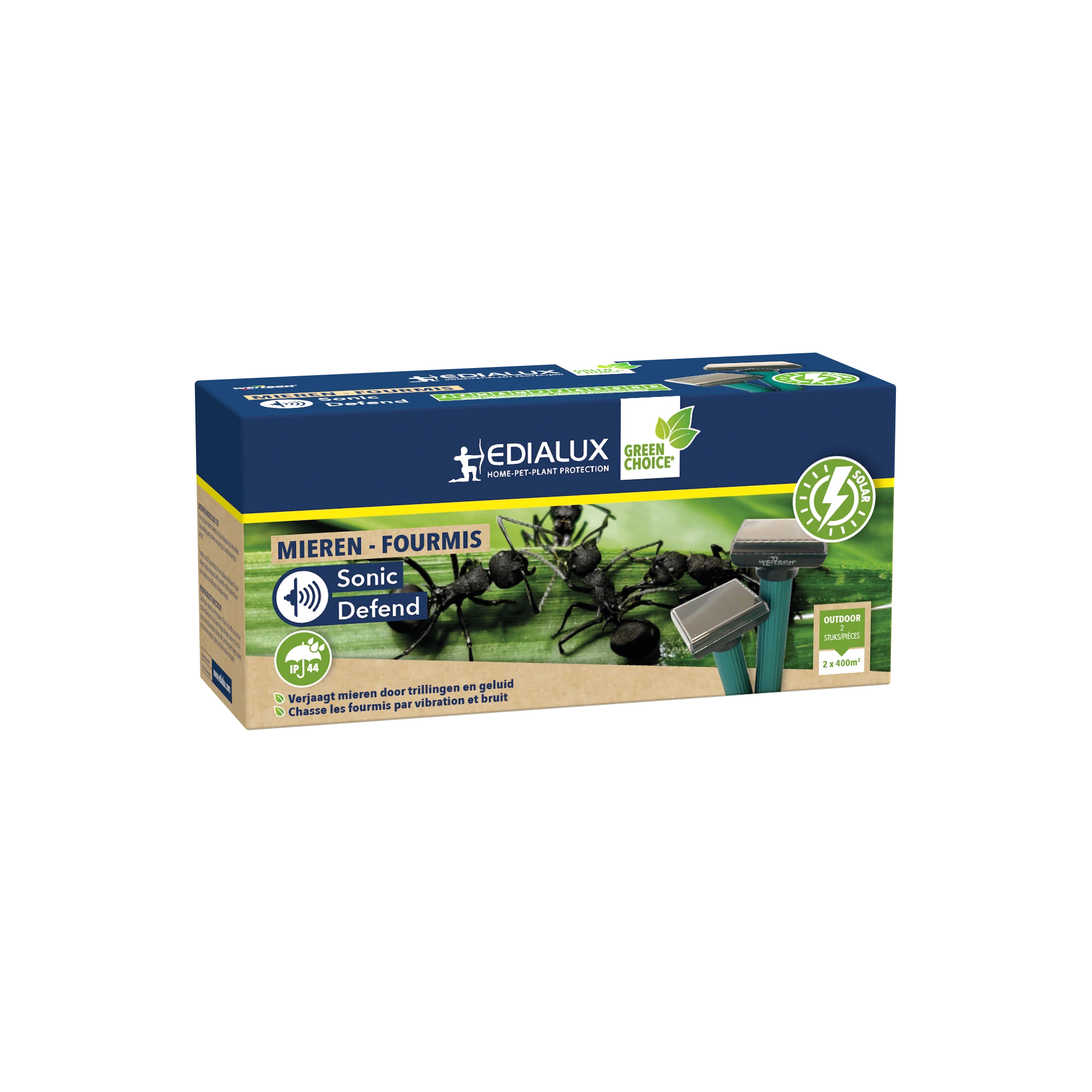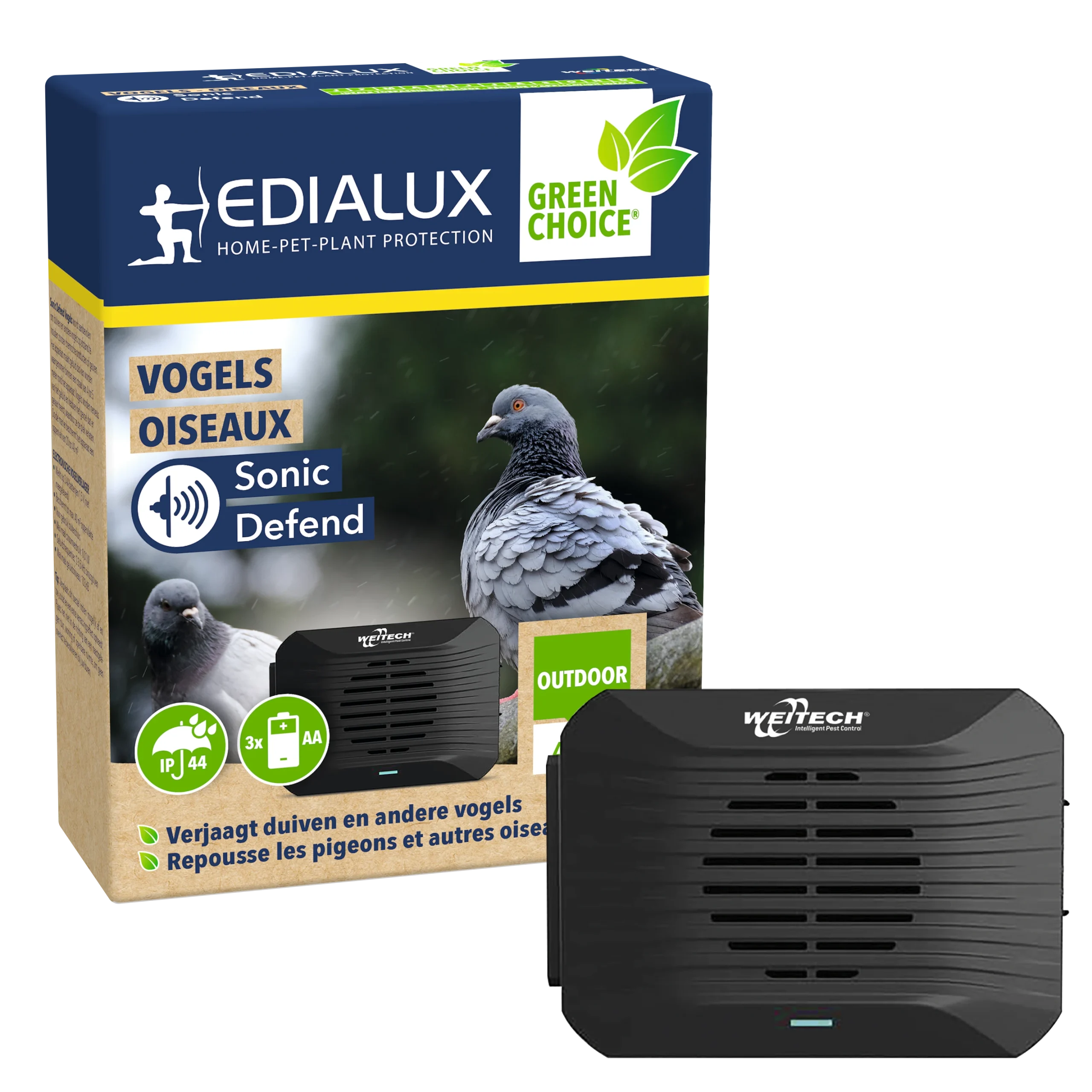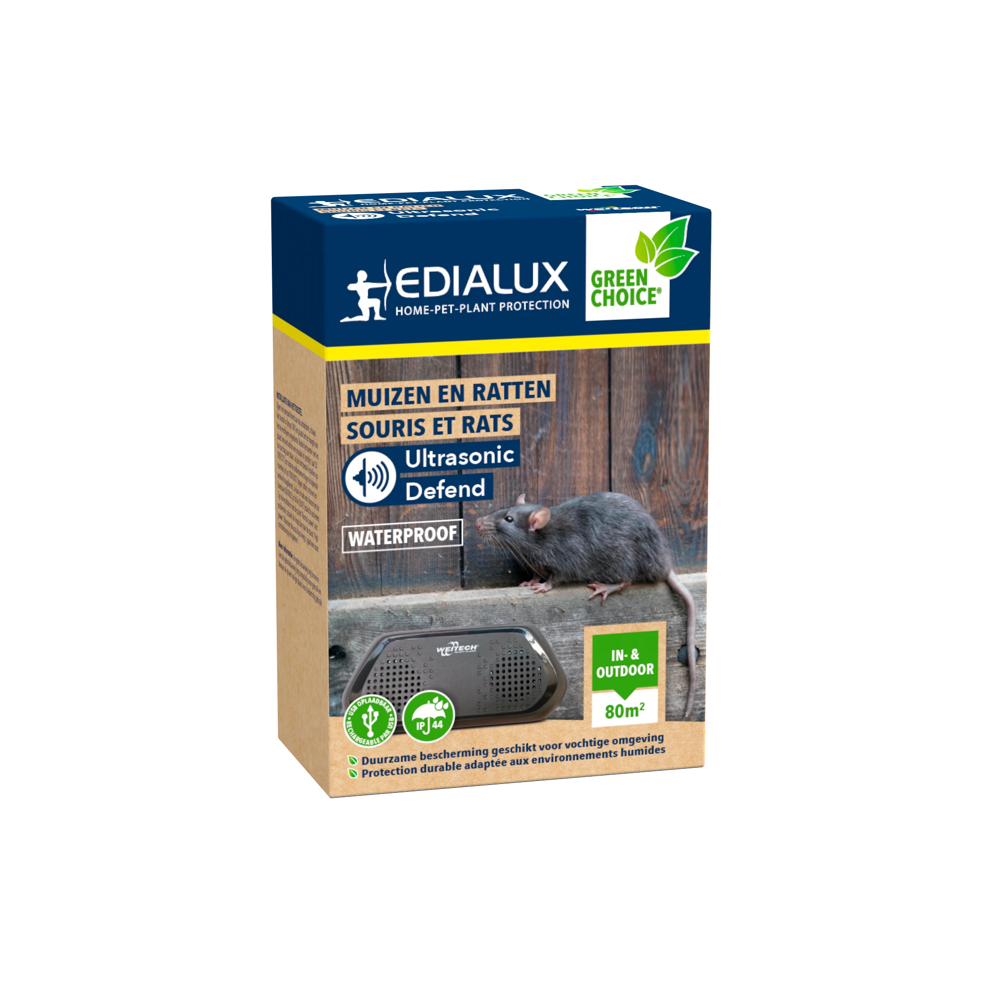 Ultrasoon apparaat om katten en honden of andere ongewenste dieren uit de tuin te verjagen. Het toestel heeft drie verschillende ultrasone frequentieinstellingen aangepast aan kleine of grote zoogdieren en kan zowel met een tijdsinterval of met de bewegingssensor ingesteld worden. Het geluid varieert constant, zodat dieren niet wennen aan het geluid en er niet resistent tegen worden. Het toestel kan aan de muur bevestigd worden of in de grond geplaatst met de bijgevoegde paal. Dit toestel werkt op 2 batterijen (9 volt, niet meegeleverd) of kan met de afzonderlijk verkrijgbare Adapter Ultrasonic Defend Edialux (1112000106) aan het elektriciteitsnet aangesloten worden.