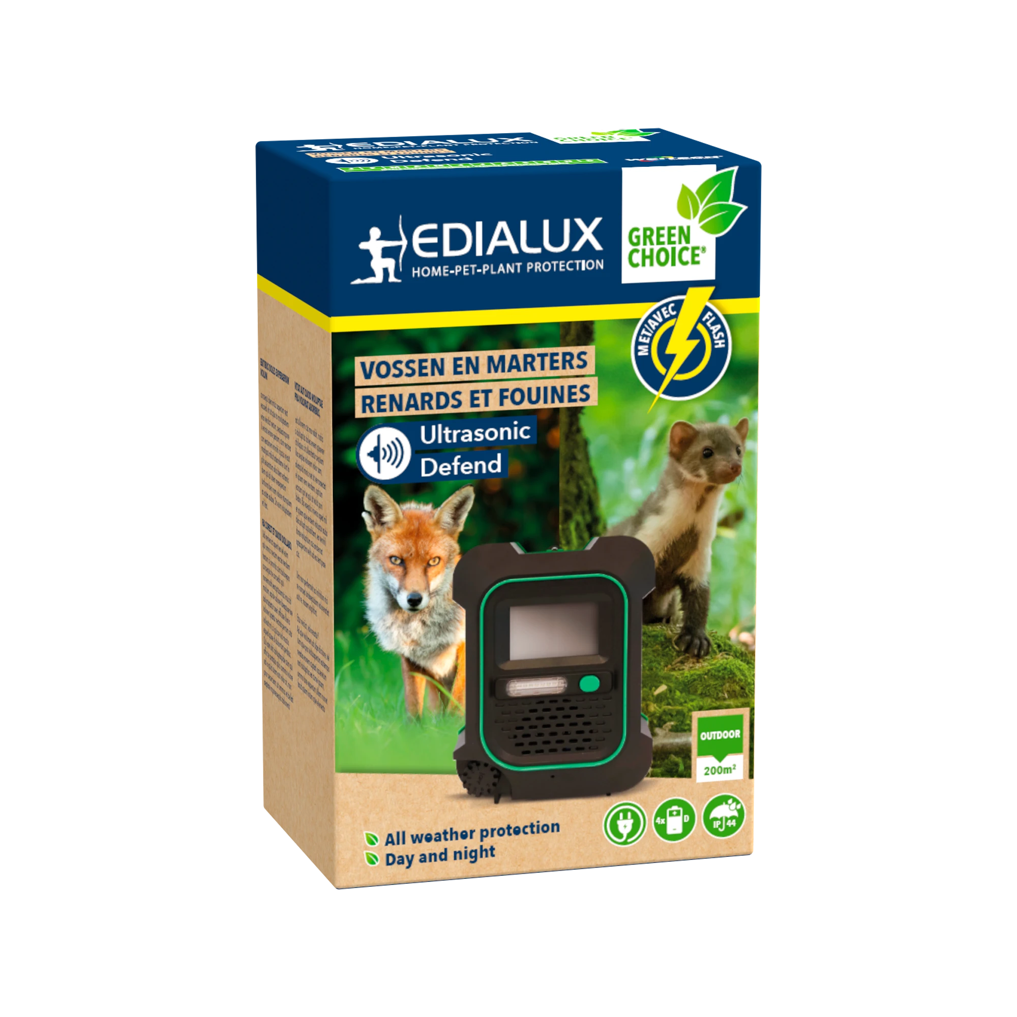 Ultrasoon apparaat met flash om vossen en marters of andere ongewenste dieren uit de tuin te verjagen. Het toestel heeft zeven verschillende ultrasone frequentie instellingen aangepast aan kleine of grote zoogdieren en heeft zowel een bewegingssensor als een flash (die ook kan uitgeschakeld worden). Het geluid varieert constant, zodat dieren niet wennen aan het geluid en er niet resistent tegen worden. Dit toestel werkt op 4 D batterijen (1,5 volt, niet meegeleverd) of kan met de afzonderlijk verkrijgbare Adaptor Ultrasonic Defend Vossen & Marters (1112000101) aan het elektriciteitsnet aangesloten worden.