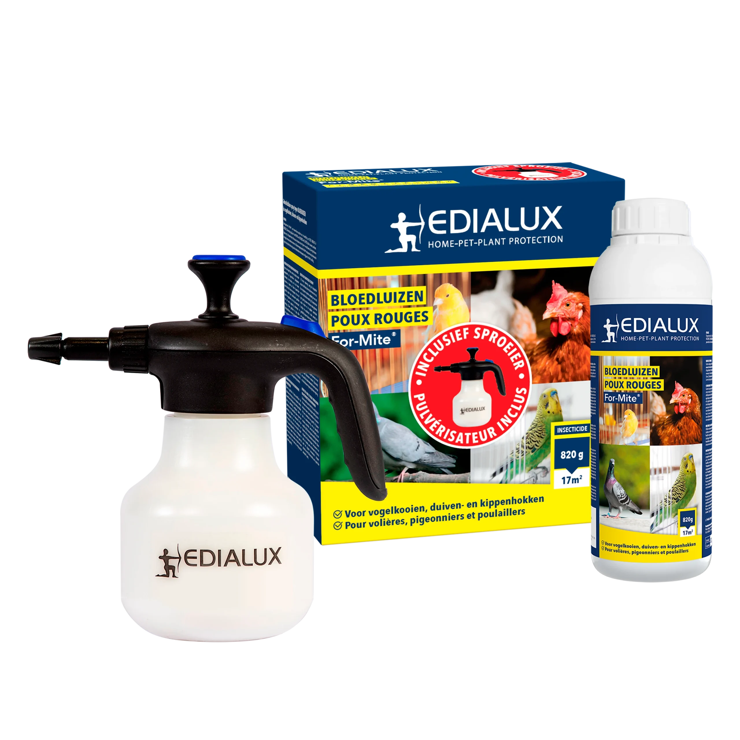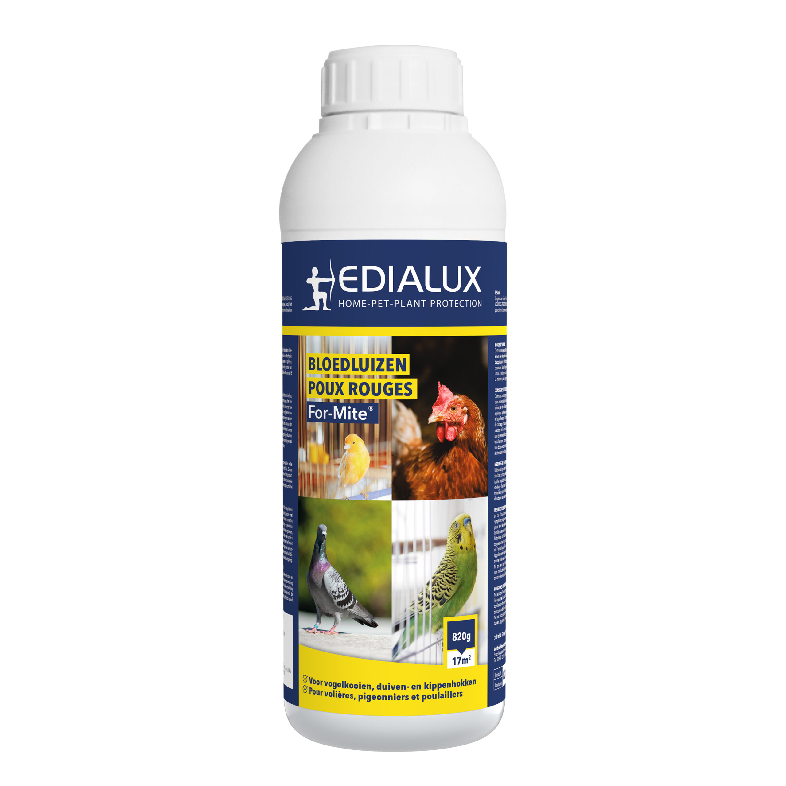 Een gebruiksklare omgevingsspray voor de bestrijding van rode vogelmijt of bloedluis in kleine vogelkooien (bv: duiven-, kanarie-, parkieten-, kippenhokken, enz). De spray kan gesproeid worden op alle oppervlakken van het hok. Belangrijk is om vooral spleten en holten te behandelen daar waar de mijten zich kunnen verschuilen. Het product zal zich vasthechten tussen de pootjes van de mijten en vervolgens worden ze hierdoor geïmmobiliseerd. Vogels voor de behandeling verwijderen.