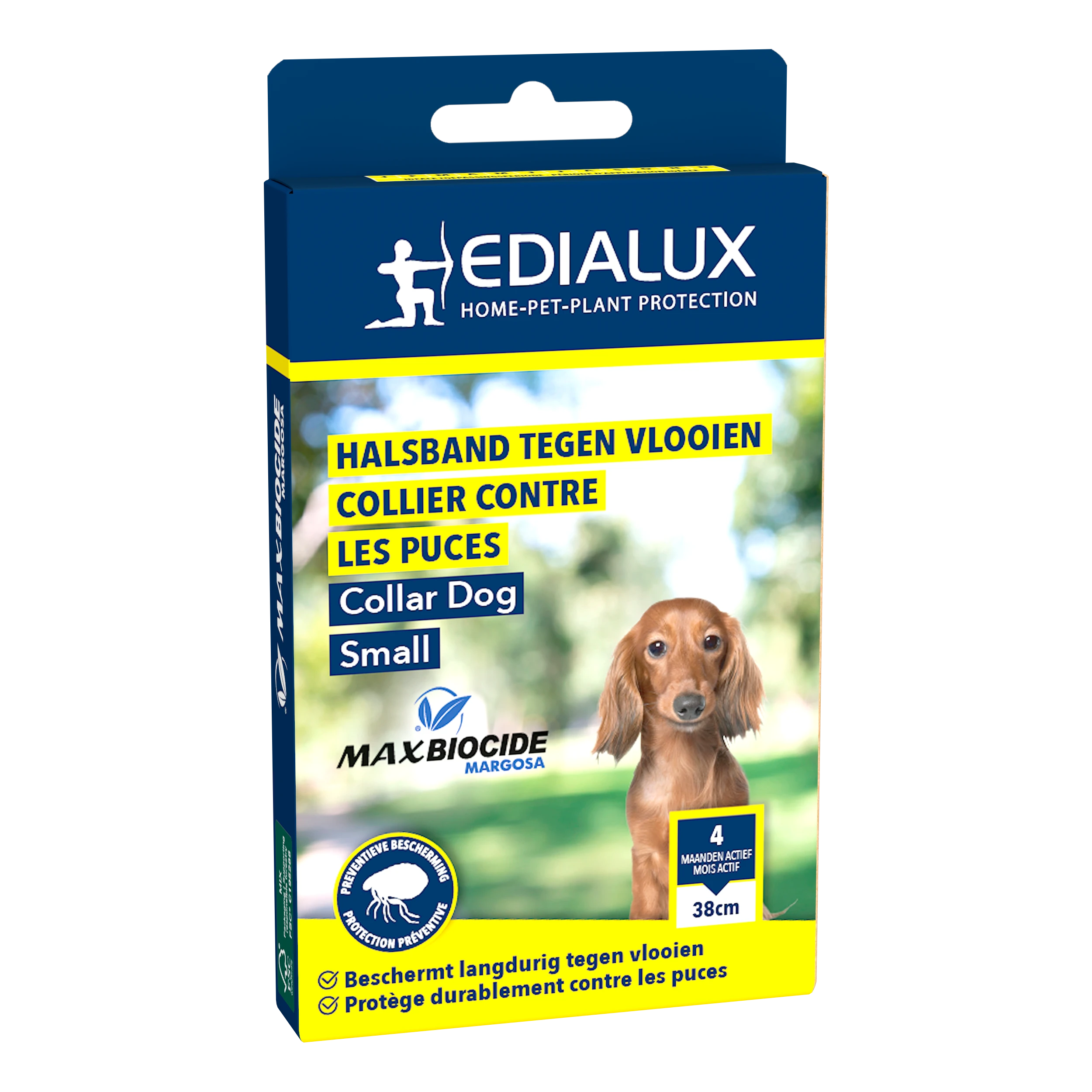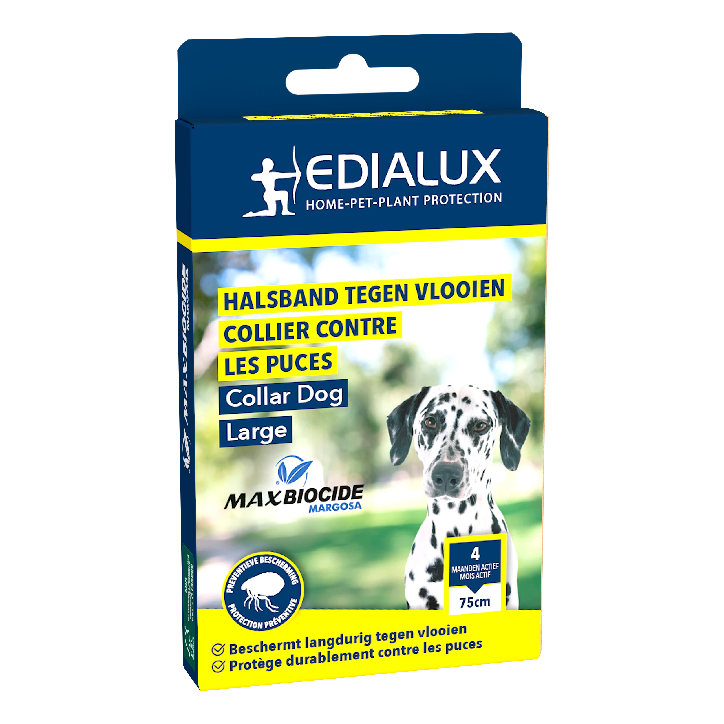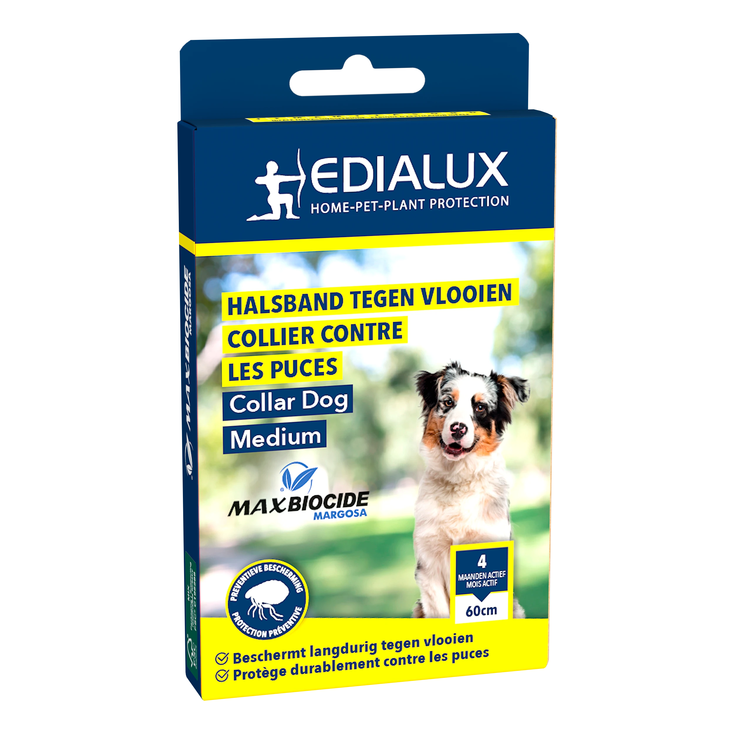 Max Biocide Collar is een ecologisch halsband met margosa extract, met een preventief effect tegen vlooien bij honden. De halsband heeft een werking van 4 maanden. De werkzame stof dringt door tot in de vacht van het dier en door direct contact worden de vlooien verjaagd. Niet gebruiken op zieke en herstellende dieren en op pups of kittens jonger dan 10 weken.