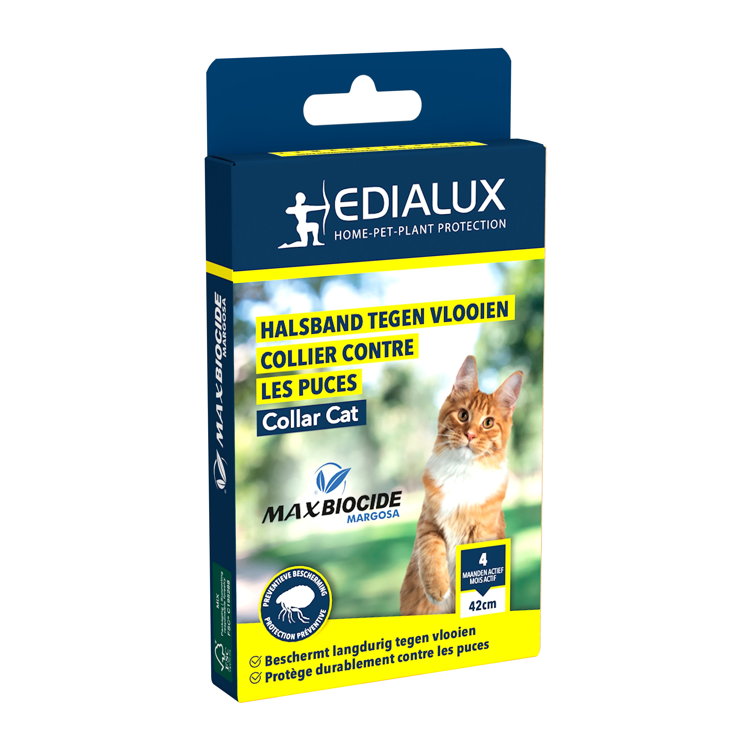 Max Biocide Collar is een ecologisch halsband met margosa extract, met een preventief effect tegen vlooien bij katten. De halsband heeft een werking van 4 maanden. De werkzame stof dringt door tot in de vacht van het dier en door direct contact worden de vlooien verjaagd. Niet gebruiken op zieke en herstellende dieren en op pups of kittens jonger dan 10 weken.