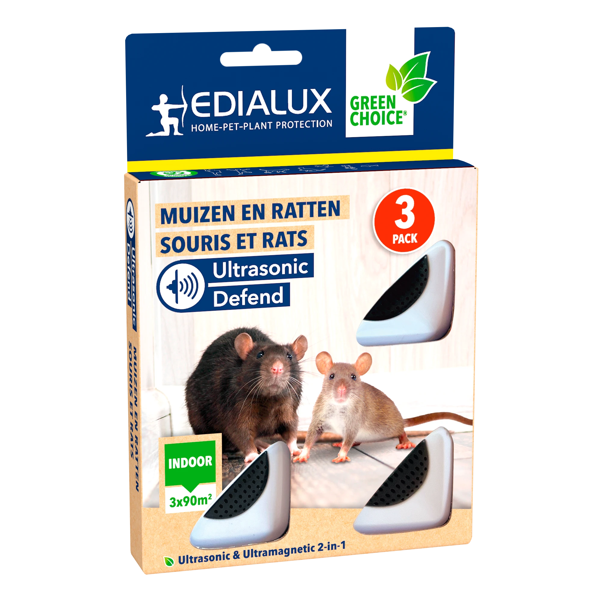 3 ultrasone apparaten voor binnenshuis tegen muizen en ratten. Het ultrasoon geluid van dit toestel is onhoorbaar voor mensen en honden, katten, vogels, vissen en reptielen. Na 2 tot 4 weken continu gebruik verdwijnen muizen en ratten omdat zij zich niet kunnen aanpassen aan de krachtige ultrasone trillingen waarvan de frequentie constant verandert.