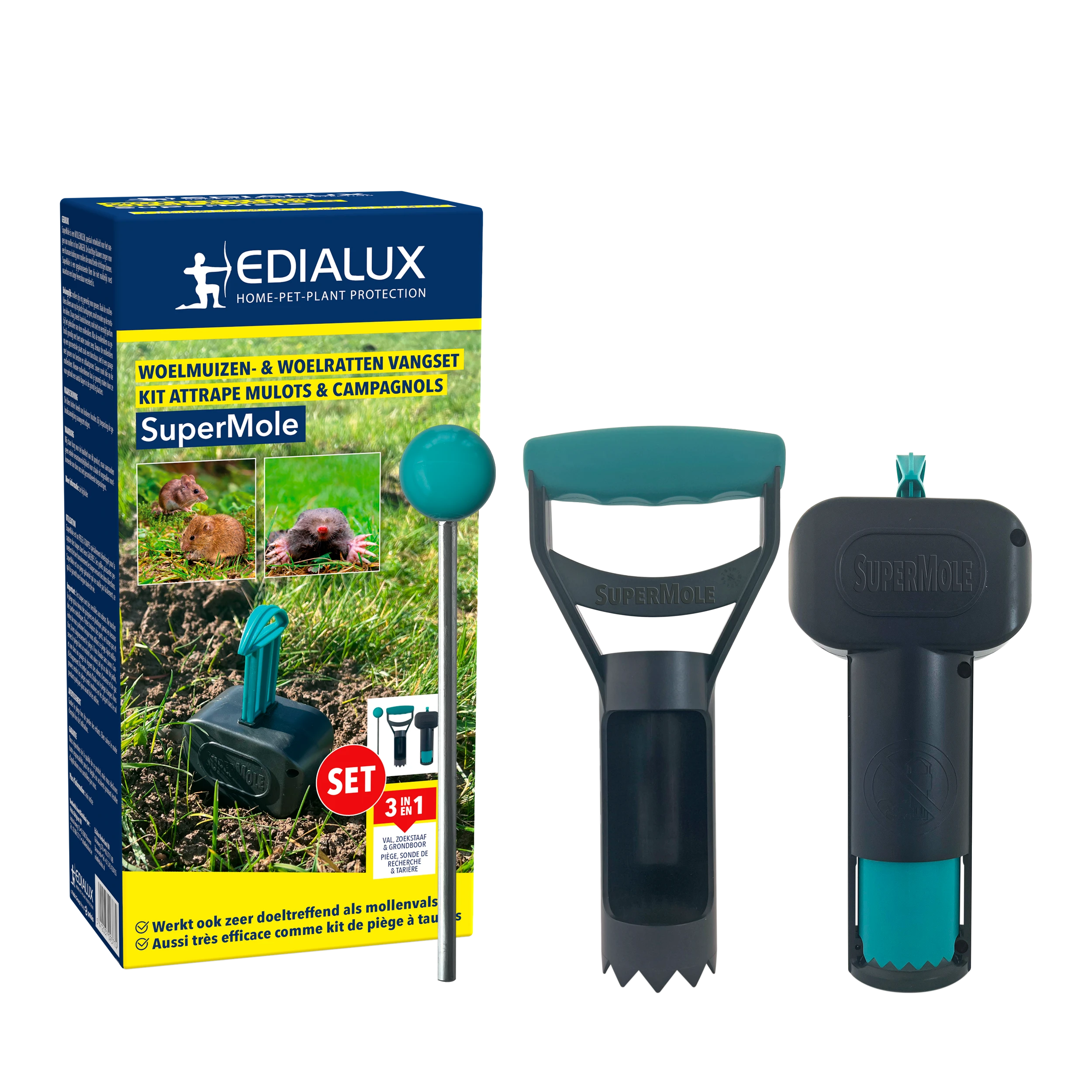 Deze 3-in-1 set bevat een SuperMole woelmuizen- en woelrattenval, een zoekstaaf om op zoek te gaan naar woelmuisgangen en een grondboor om heel eenvoudig een gat te graven op maat van deze val. Deze val is ook geschikt om mollen te vangen. Eens opgespannen volstaat een lichte tik van het dier tegen de trekker in zijn gang om de drietand met volle kracht naar beneden te duwen met een onmiddellijke dood als gevolg. Deze effectieve, gebruiksvriendelijke en milieuvriendelijke val heeft geen lokaas nodig.