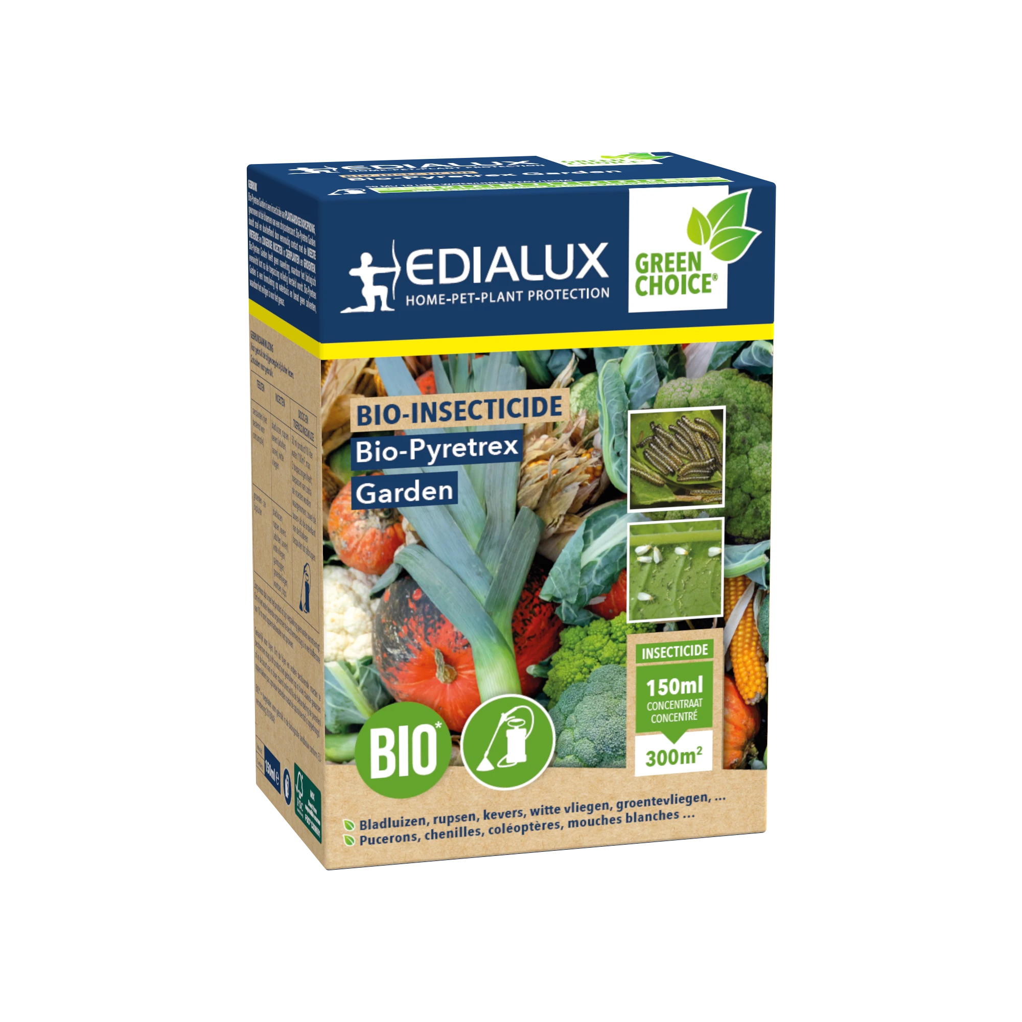 Contact-insecticide dat snel en doeltreffend een breed spectrum aan vretende en zuigende insecten op sierplanten en groenten bestrijdt. Pyrethrinen, de actieve component in Bio-Pyretrex Garden heeft een plantaardige oorsprong. Het product heeft geen nawerking, waardoor het biologisch evenwicht kort na de toepassing volledig hersteld wordt. Kan gebruikt worden in de biologische teelt. De wachttijd voor de oogst is slechts 2 dagen. Voor de meest optimale werking ’s avonds toepassen.