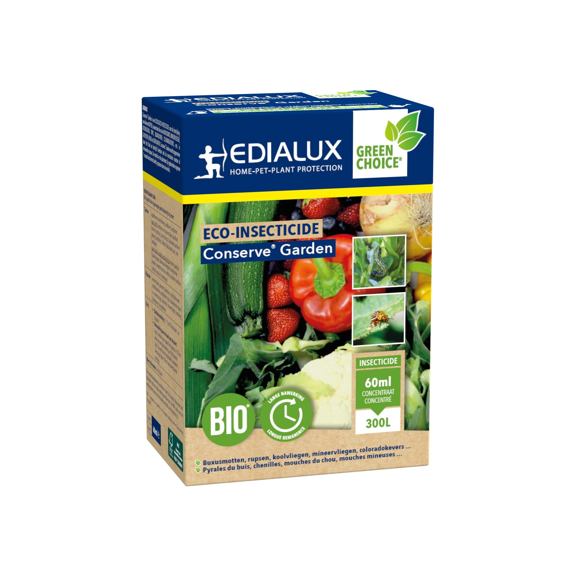 Conserve® Garden is een ecologisch insecticide voor de bestrijding van diverse rupsen, waaronder die van de buxusmot, mineervliegen, koolvliegen, trips, bladvlooien, coloradokevers, enz. in groenten, fruit en sierplanten. Conserve® Garden wordt opgenomen door het blad en bestrijdt hierdoor ook de verscholen insecten of minerende rupsen. De wortels en de plantvoet zijn gedurende ongeveer 1 maand beschermd dankzij opname door de wortels.