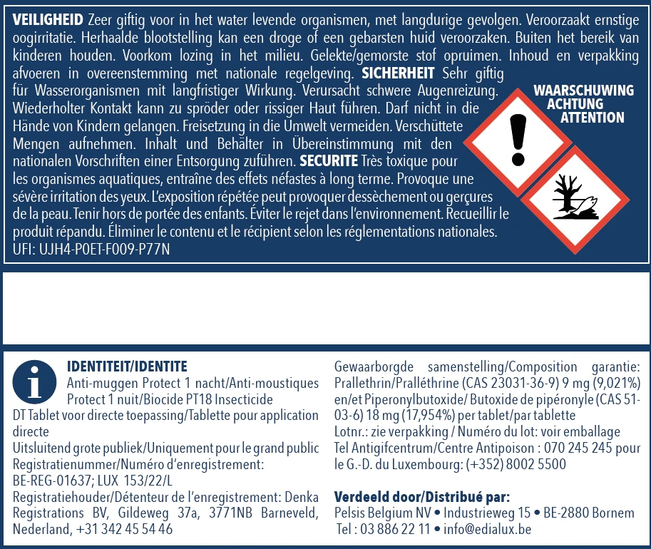 - De antimuggenwerking van één tablet duurt tot 10 uur.