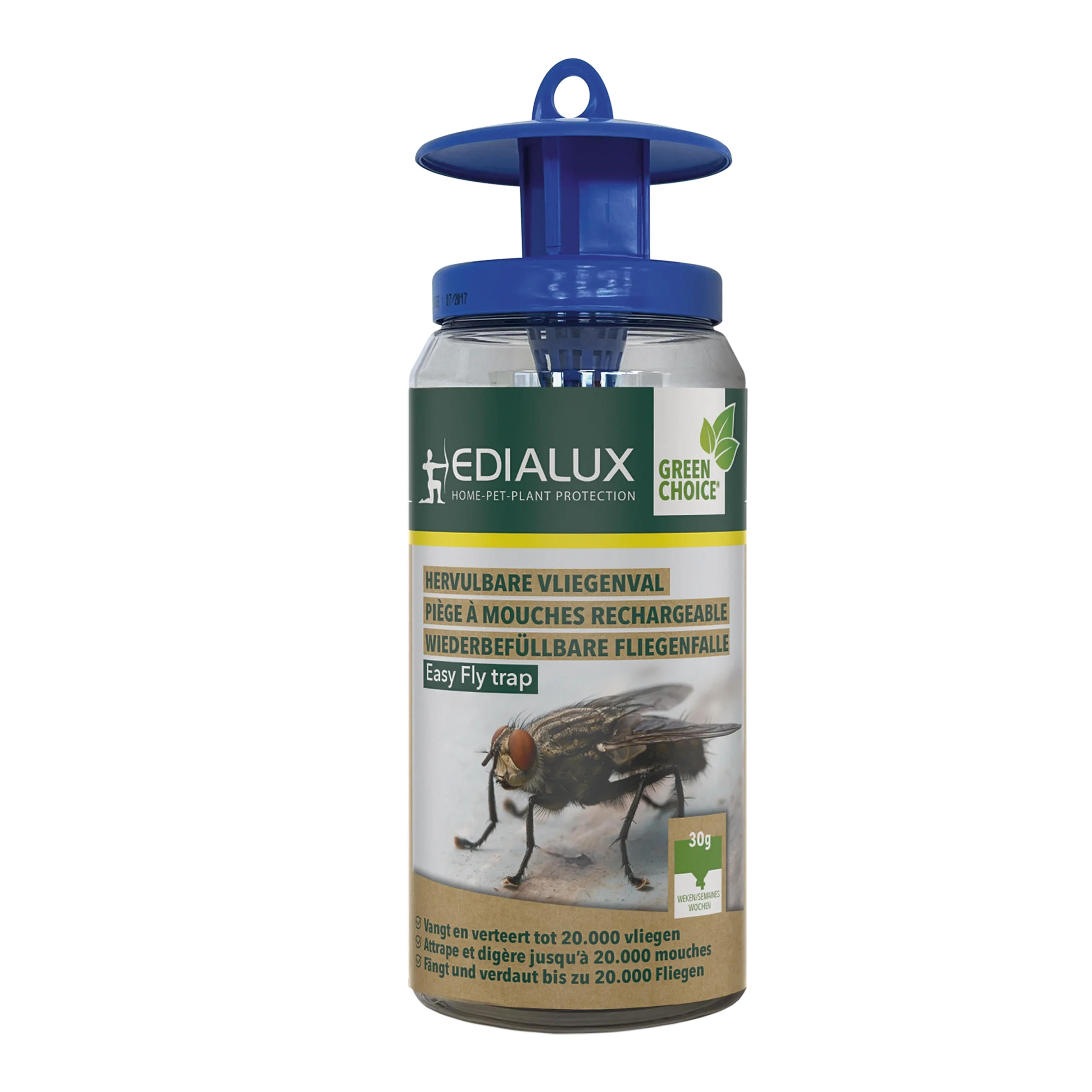 Gifvrije val voor vliegen waarbij de vliegen worden aangetrokken door een unieke lokstof. Vangt en verteert tot 20 000 vliegen, zonder de val te moeten ledigen. Ideaal voor rond de woning, dierenhokken, afvalcontainer, enz.