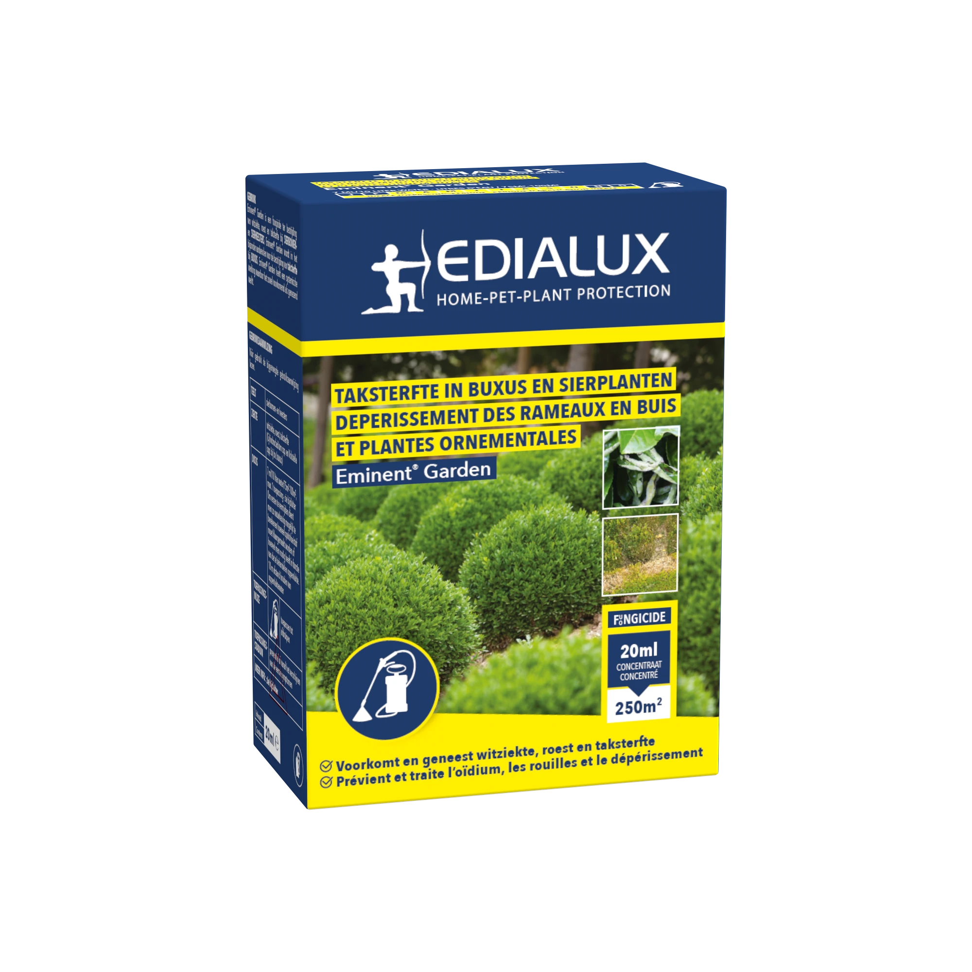 Tegen schimmelziekten in sierbomen en –heesters. Sterk aanbevolen voor schimmelproblemen bij buxus zoals o.a. taksterfte. Eminent® Garden heeft een systemische werking waardoor het zowel voorkomend als genezend werkt.