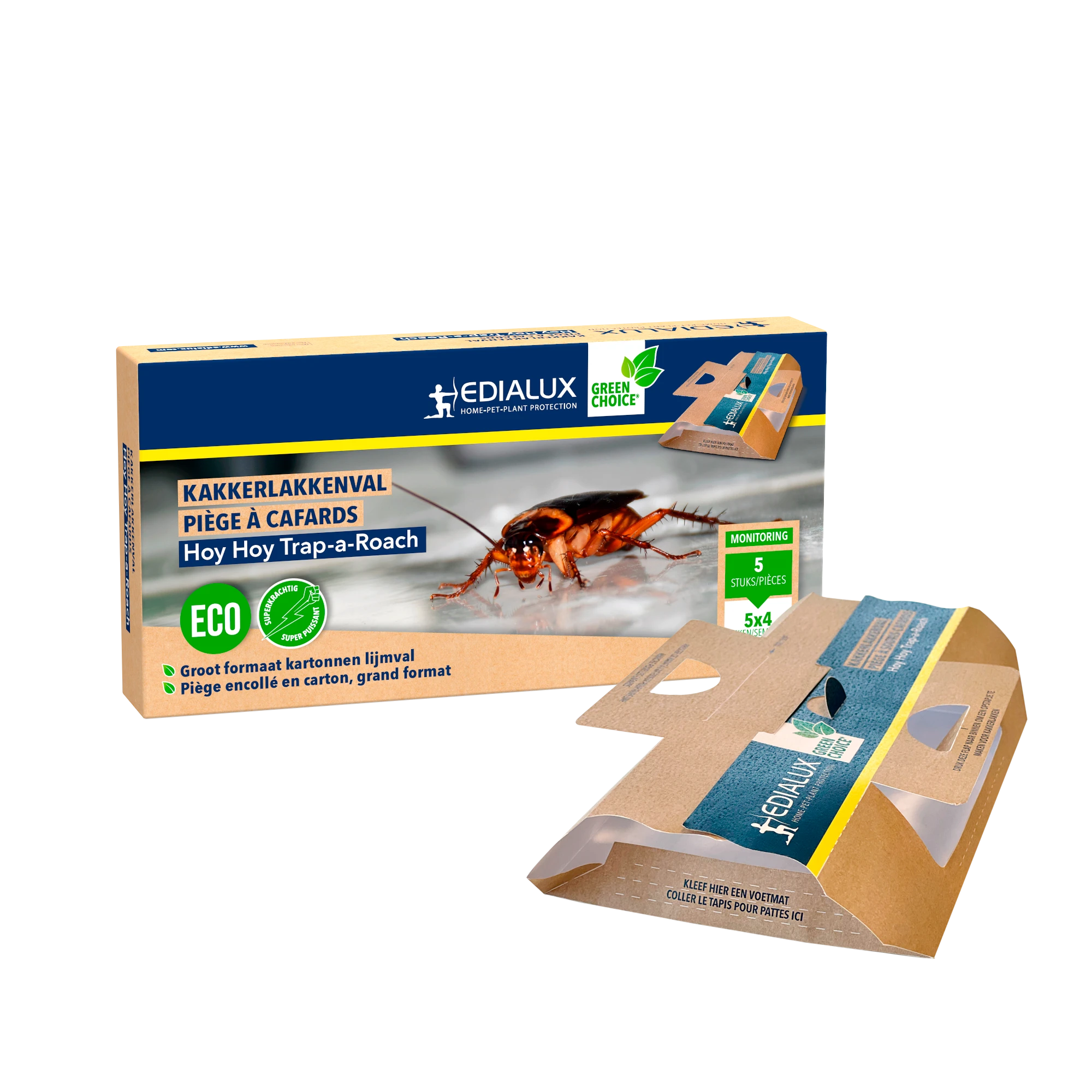 Kakkerlakkenval met 5 zakjes Hoy Hoy lokstof op basis van natuurlijke producten. Door de langzame afgifte van de lokstof werkt de val gedurende 3-4 weken. De val geurt niet en is compleet gifvrij: de kakkerlakken blijven kleven aan de lijmplaat. Plaats één val per kamer langs de muur en vermijd direct zonlicht. Ook geschikt voor monitoring van andere kruipende insecten zoals spinnen, pissebedden en zilvervisjes.