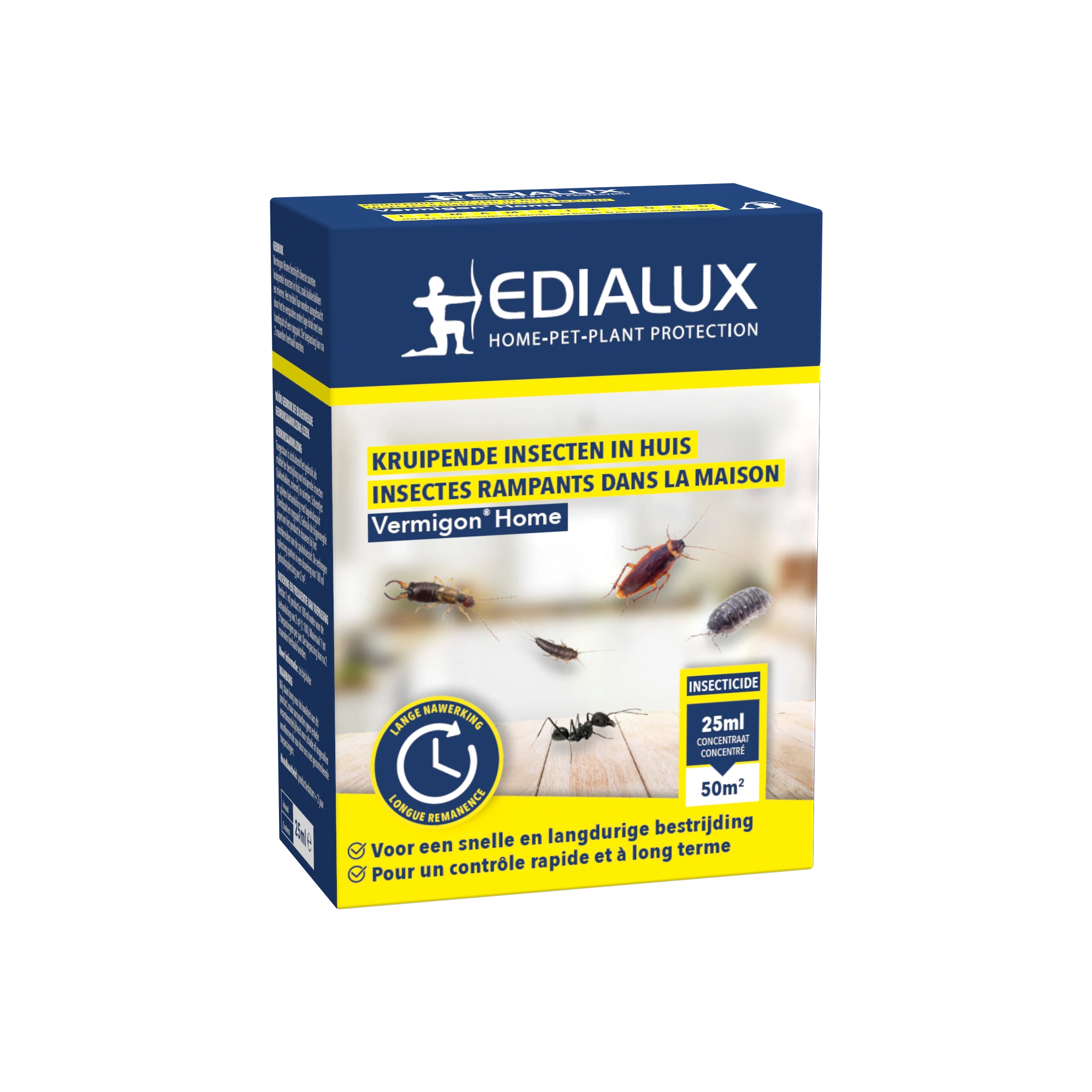 Vermigon® Home is een vloeibaar concentraat met lange nawerking tegen mieren, kakkerlakken, vlooien, zilvervisjes en vele andere kruipende insecten. Het kan binnenshuis worden gebruikt en is uitermate geschikt voor de behandeling van naden en kieren. Met het bijgeleverde pipetje verdun je de super geconcentreerde vloeistof in water om het onder lage druk te verspuiten met een hand- of rugsproeier.
