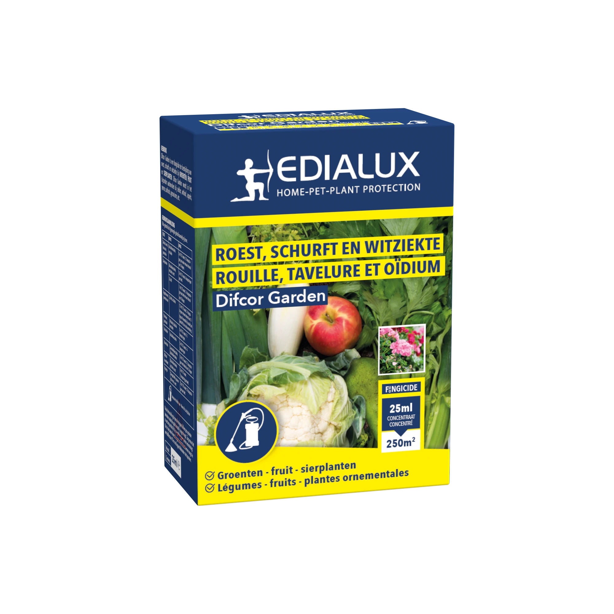Difcor Garden is een ziektebestrijder tegen roest, schurft en witziekte bij groenten, fruit en sierplanten. Het is een systemisch fungicide met een preventieve en helende werking.