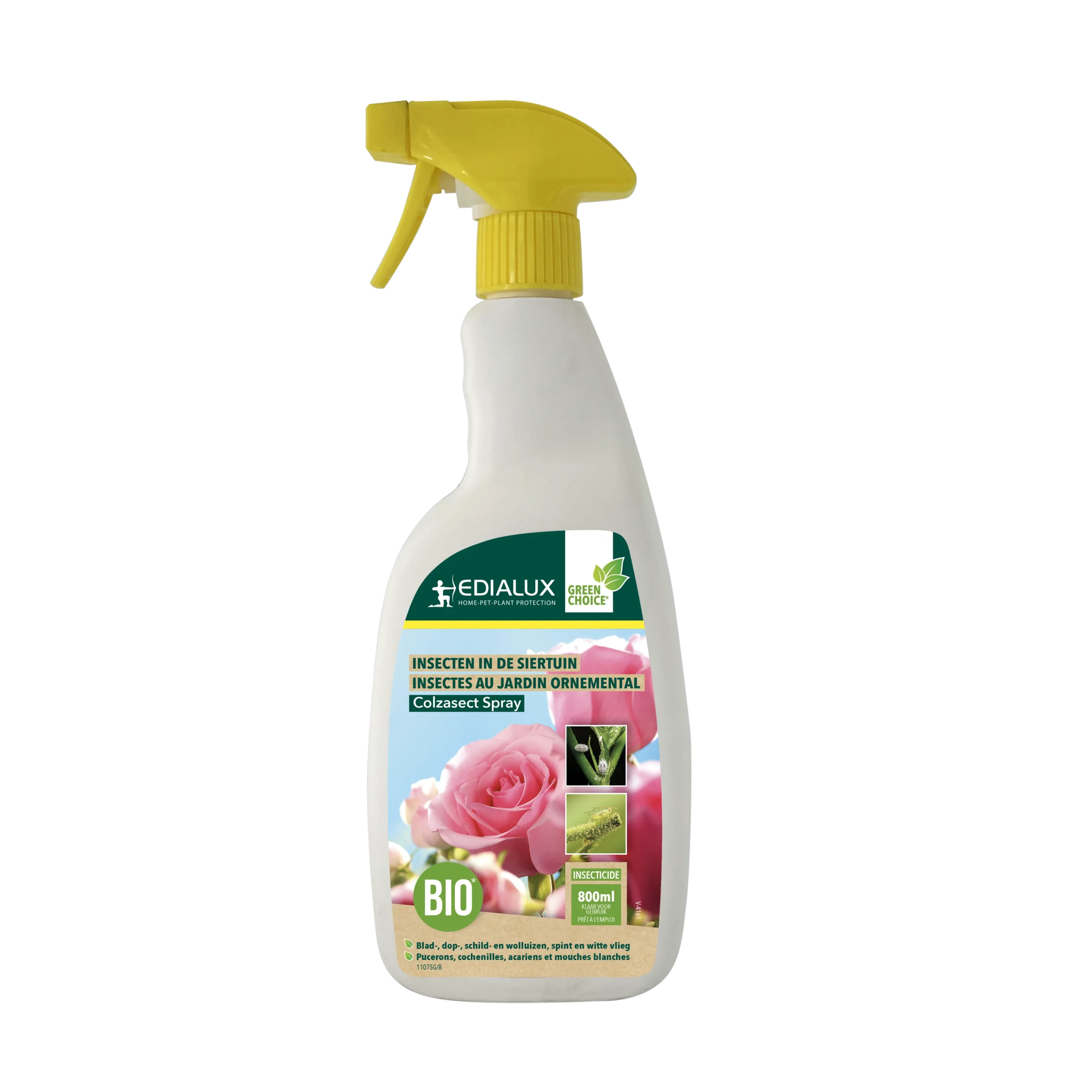 Colzasect Spray bestrijdt een brede waaier aan insecten zoals bladluizen, wolluizen, witte vlieg en spint. De gebruiksklare spray vernietigt zowel eitjes, larven als volwassen insecten door fysiek contact: er vormt zich een film waardoor het insect verstikt. Geschikt voor alle sierplanten in open lucht en onder bescherming. Bovendien is het product efficiënt in alle ontwikkelingsstadia van de insecten. Je kan dus zowel eitjes, larven als volwassen insecten ecologisch bestrijden.