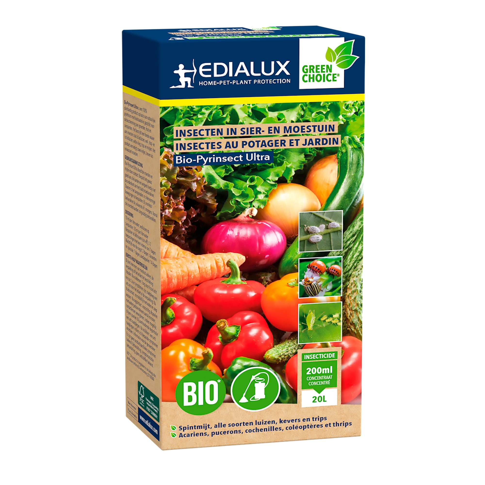 Bio-Pyrinsect Ultra is een 100% plantaardig product op basis van natuurlijke pyrethrum met koolzaadolie voor de bescherming van groenten, fruit en sierplanten. Het bestrijdt een brede waaier aan insecten zoals bladluizen, wol-, dop- en schildluizen, witte vlieg, trips en mijten.